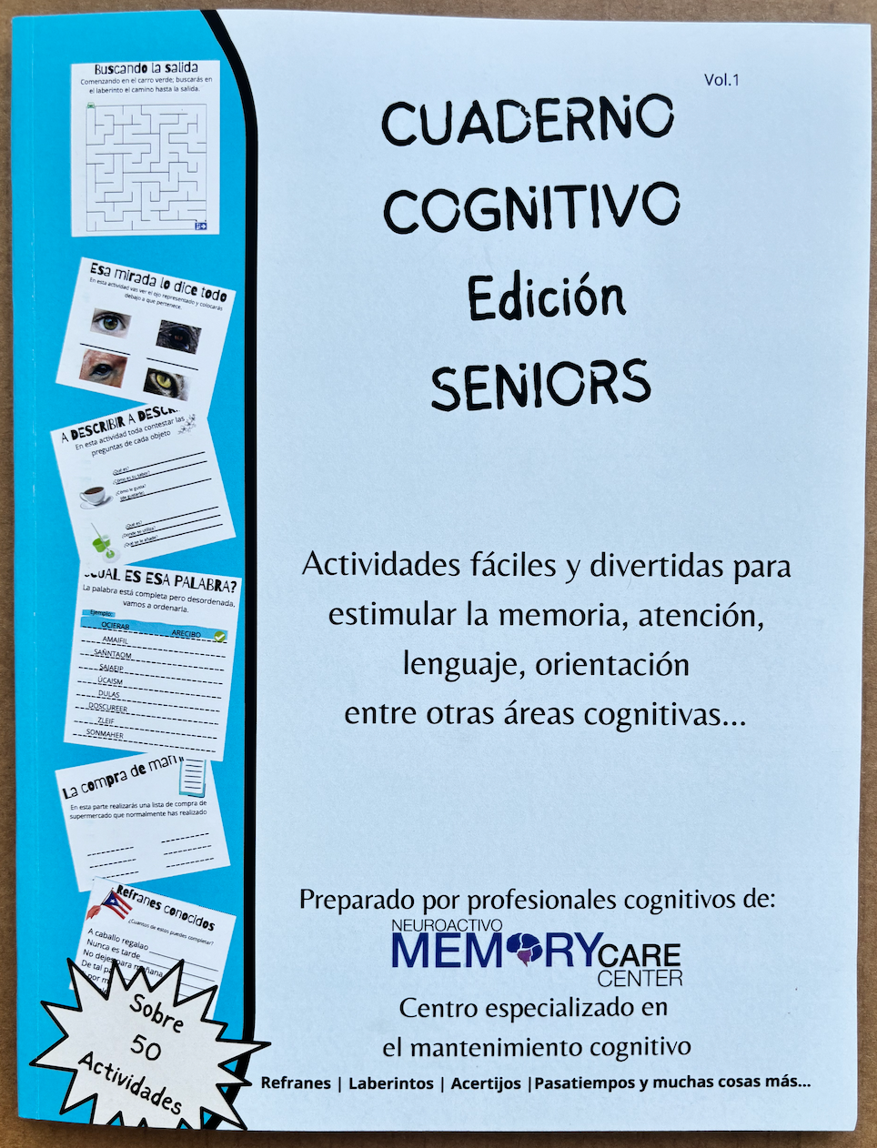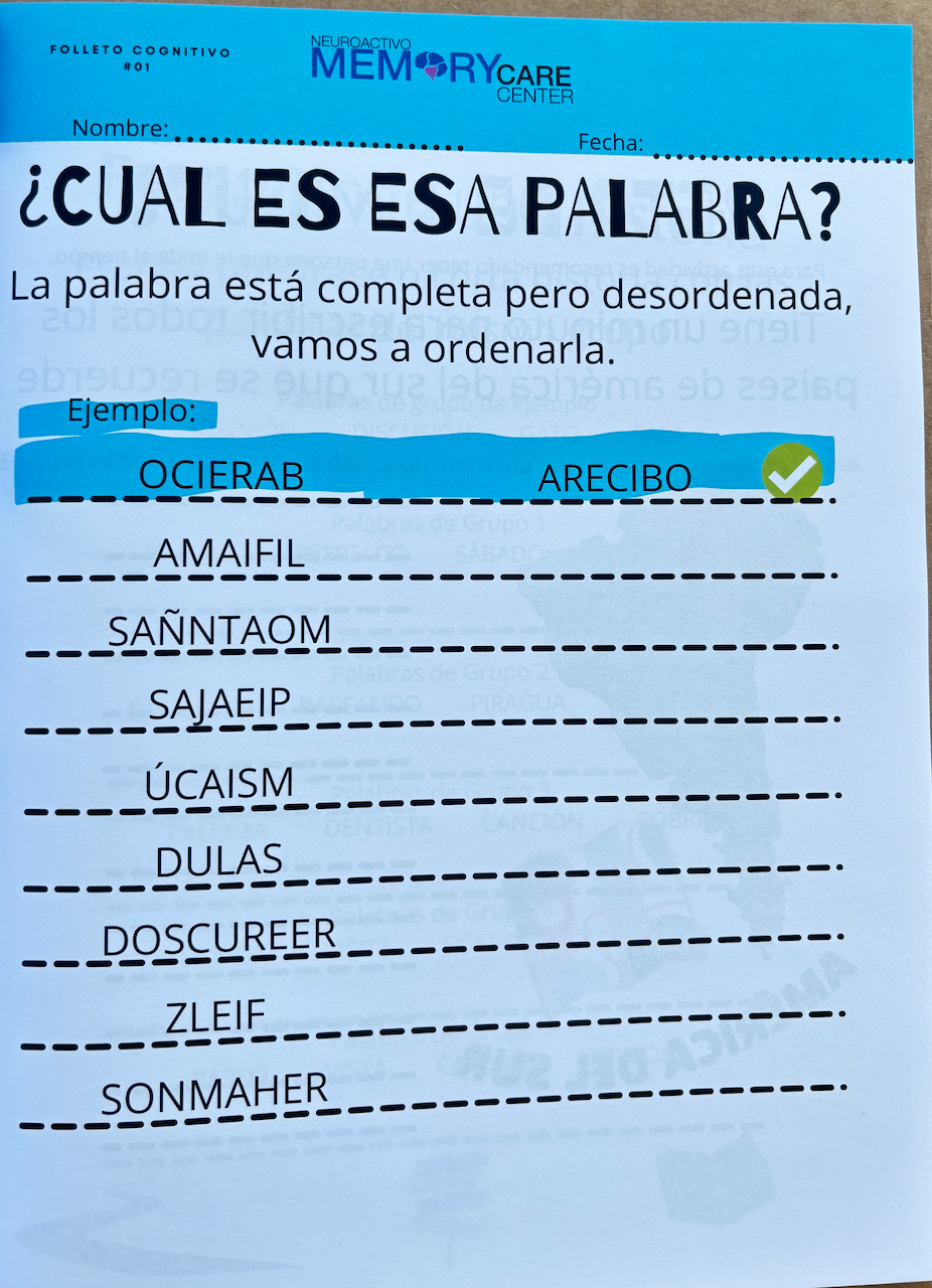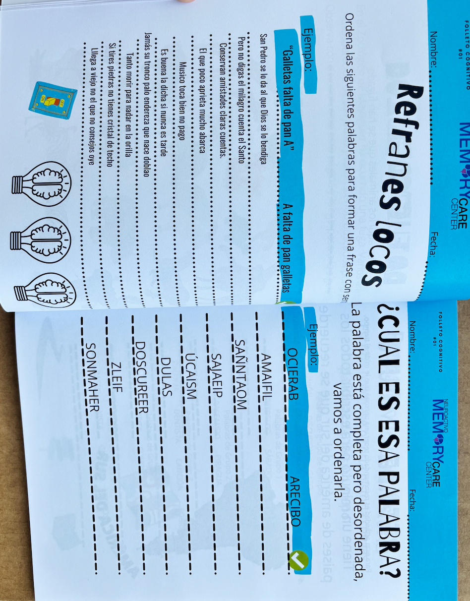 Perfecto para Centros de Cuido. Cuaderno diseñado para la estimulación cognitiva en el adulto mayor. Actividades fáciles y divertidas para estimular la memoria, atención, lenguaje, orientación, entre otras áreas cognitivas.